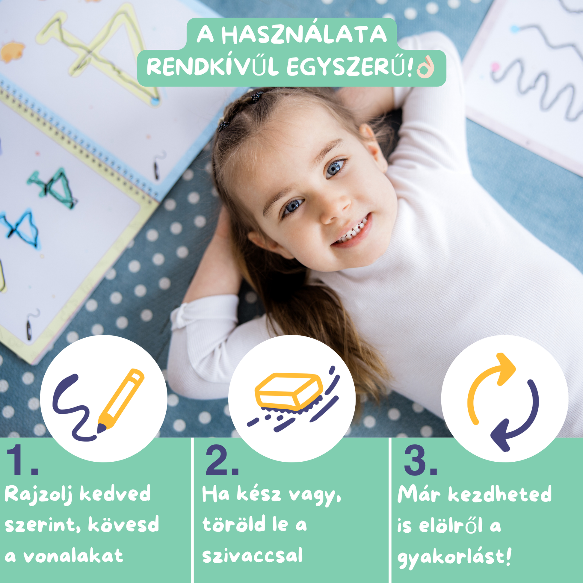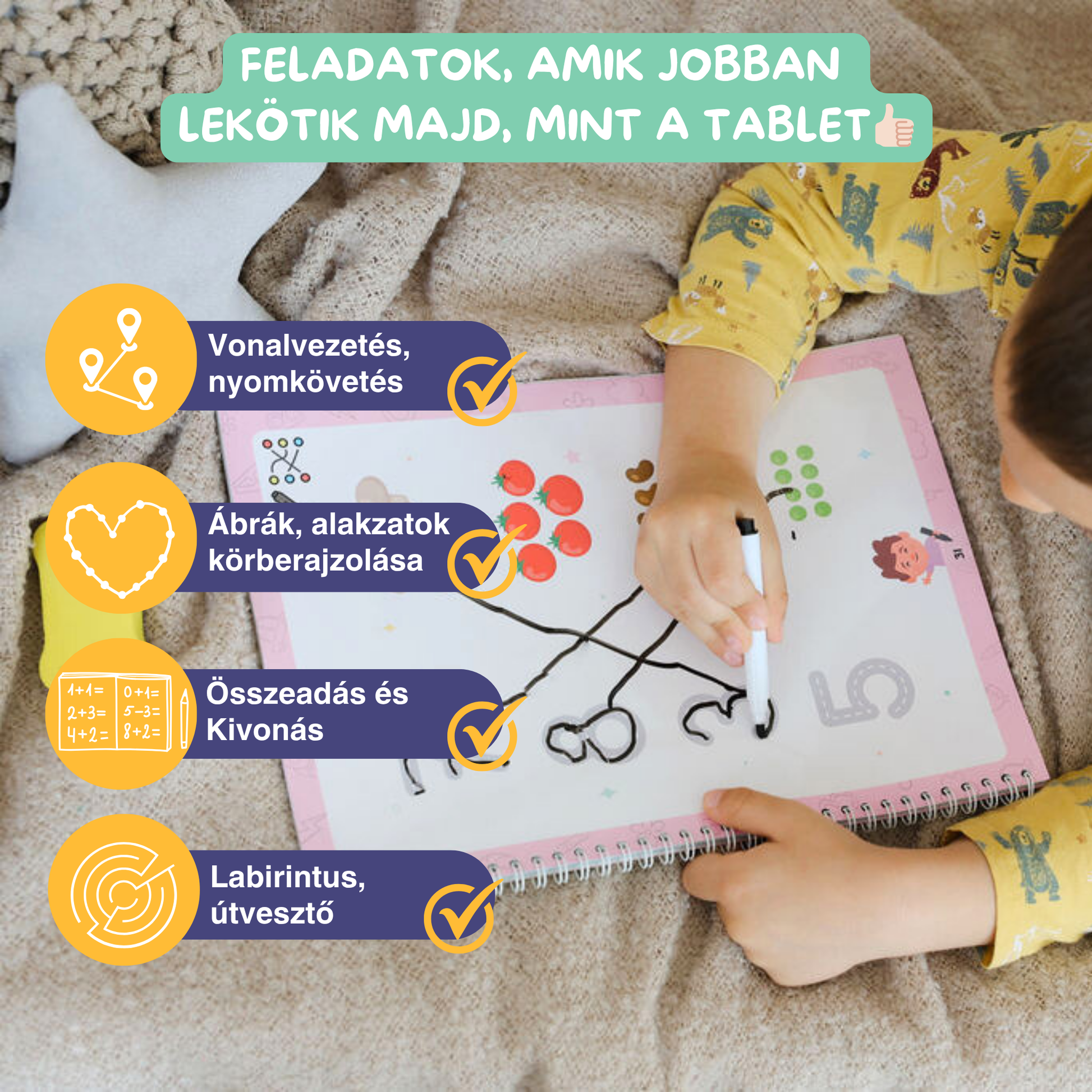 Igen, a füzet minden oldalt letörölhető! A csomagban található speciális filctollal lehet rajzolni, majd a mellékelt puha szivaccsal könnyen, gyorsan eltávolítható a tinta. Ez azt jelenti, hogy újra és újra használható – nem kell minden héten új munkafüzetet venni.